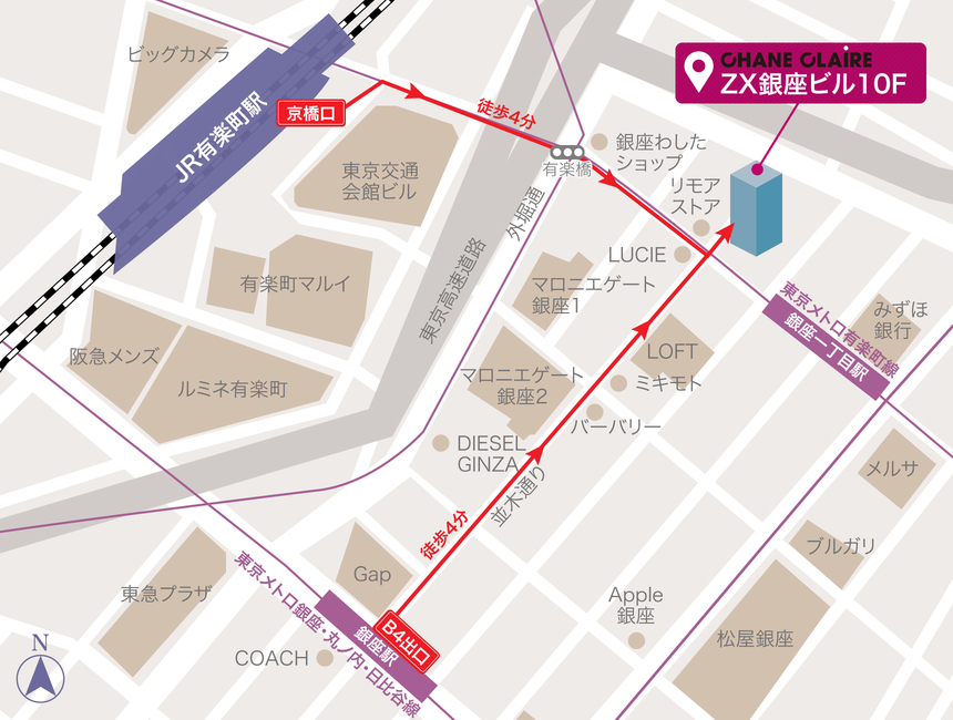 - 地下鉄「銀座駅」B4番出口徒歩3分、JR「有楽町駅」京橋口徒歩4分